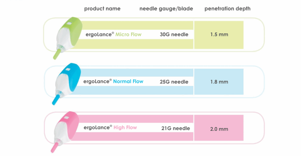 ergoLance safety lancets are available in three versions, each marked with a different color for easier identification: