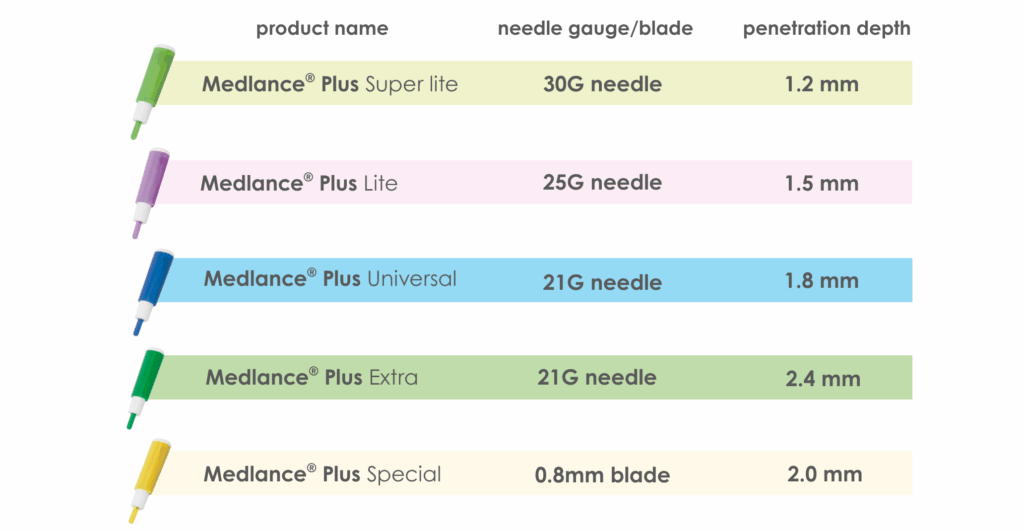 Medlance Plus safety lancets are available in five versions, each marked with a different color for easier identification: