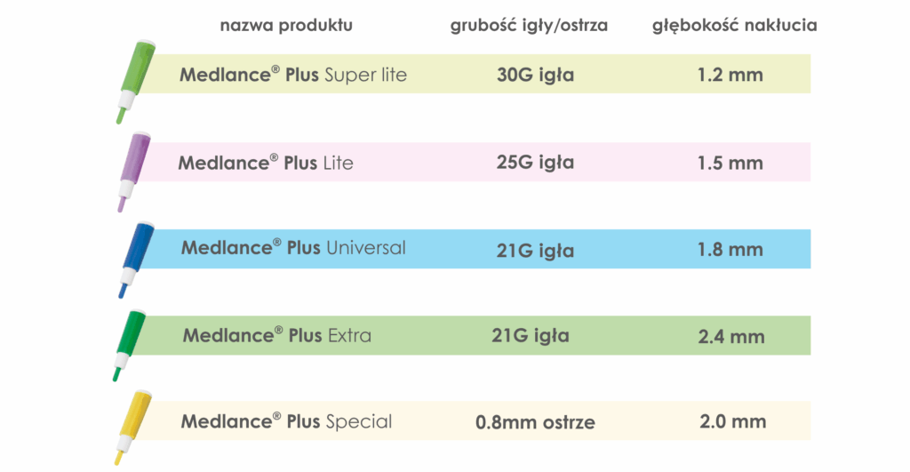 Lancety bezpieczne (nakłuwacze) Medlance Plus są dostępne w pięciu wersjach, z których każdą oznaczono innym kolorem w celu łatwiejszej identyfikacji: